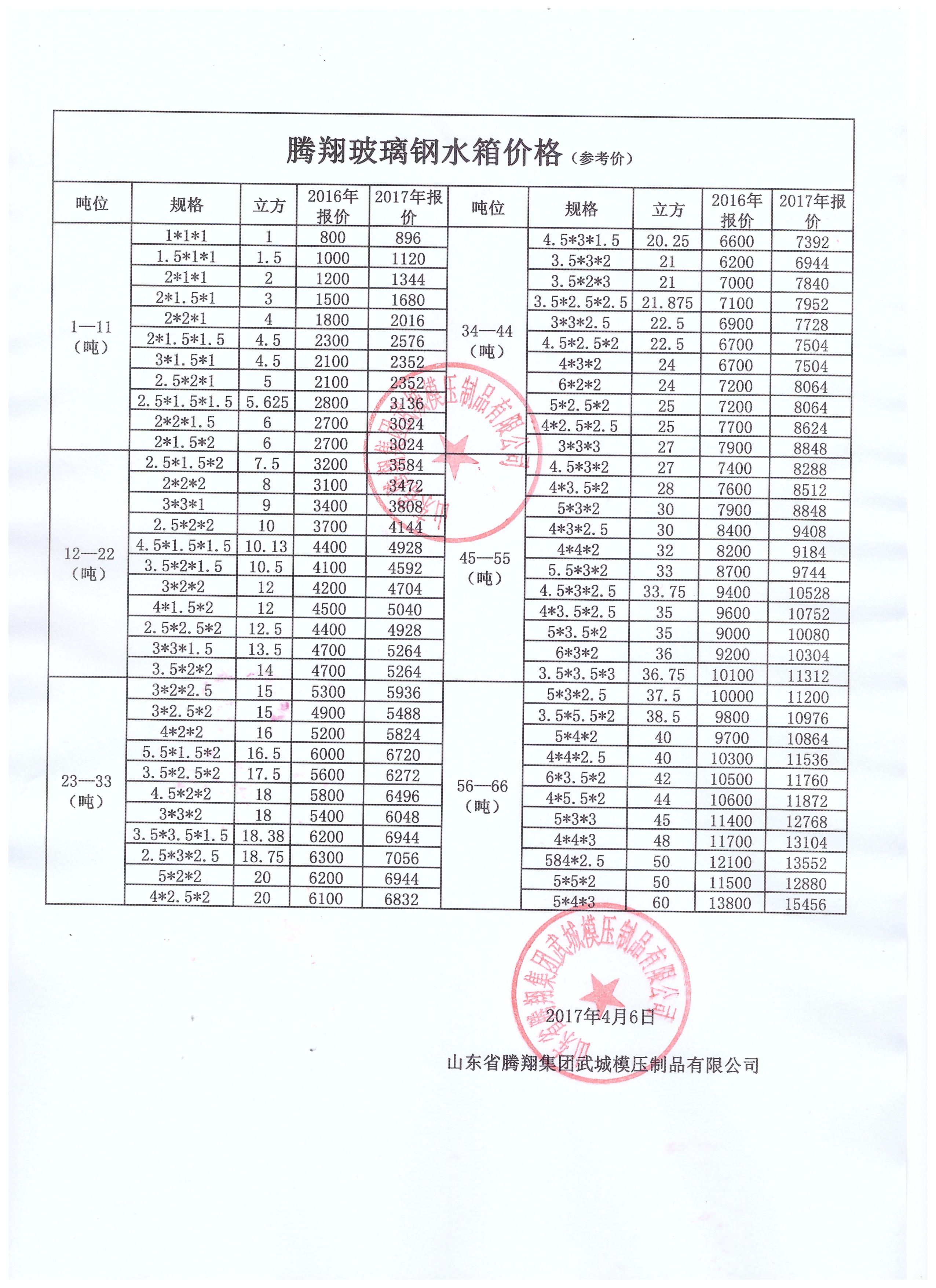 2017年玻璃鋼水箱價格表