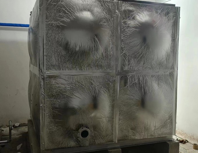 我廠承接的山東省煙臺市萊山區臺海瑪努爾設備有限公司一臺樓頂消防水箱一臺地下室飲用水箱經過三天時間已經安裝試水完成。水箱安裝在室內,采用的是橡塑鋁箔布保溫。水箱安裝現場圖如下: